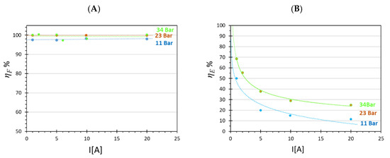 The increase in clamping pressure from 11 to 23 bar caused also a very small increase in Faradaic efficiency and a larger one in energy efficiency (Figure 9). The latter became similar at 34 and 23 bar as expected, energy efficiency being the direct consequence of electrical power consumed. The high Faradaic efficiency in all experiments confirmed that H2 crossover was negligible.