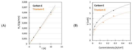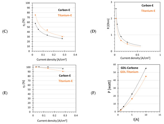 The effect of the electrode materials was investigated by replacing the titanium electrode (Titanium-E) on the cathode side with a carbon cloth electrode (Carbon-E). H2 production as a function of the current was similar for both electrodes (Figure 10A), while the type of electrodes significantly affected the polarization curve (Figure 10B). Voltages were higher for Carbon-E compared to those for Titanium-E for all current values. This suggests a higher system resistance when the Carbon-E type was used (Figure 10B). Indeed, the Carbon-E had a resistance of about 1.4 Ohm, significantly higher compared to the 0.2 Ohm of the Titanium-E type electrode. The higher electrical power needed for Carbon-E with respect to the Titanium-E, the lower the energy efficiency for Carbon-E (Figure 10C,F). With Titanium-E, the energy efficiency decreased from an initial value of 80% to 30%, while for Carbon-E, the initial energy efficiency was already slightly lower (about 57%) and further decreased to 25% at a current density of 0.28 A cm−2. On the other hand, the Faradaic efficiency was slightly higher for Carbon-E, about 100%, and was almost constant with increasing current density. This slightly higher energy efficiency for Carbon-E could be ascribed to the hydrophobicity of Carbon-GDL, which may not interact with the amount of water available on the membrane surface, preventing phenomena such as oxidation of gas diffusion layer or cathode flooding and improving Faradaic efficiency [41,43].