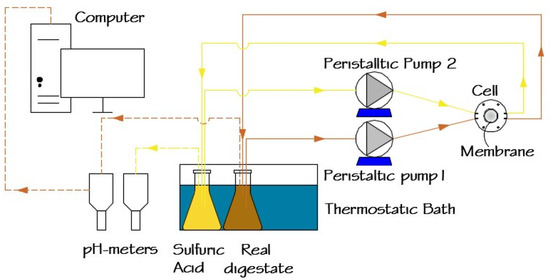 A schematic representation of the experimental setup used for ammonia recovery from digestates is shown in Figure 1. The target digestate (SD or RD) was continuously circulated using a peristaltic pump (Watson–Marlow Sci-Q 323, Spirax–Sarco Engineering plc, Cheltenham, England, UK) over the active layer of the membrane in a customized cell module [35]. A sulfuric acid solution was recirculated using a similar peristaltic pump on the support layer of the membrane. Both digestate and sulfuric acid solutions were maintained at 35 °C in a thermostatic bath (HAAKE type E12, Thermo Fisher Scientific, Waltham, MA, USA) in 0.5 L enclosed Erlenmeyer bottles.