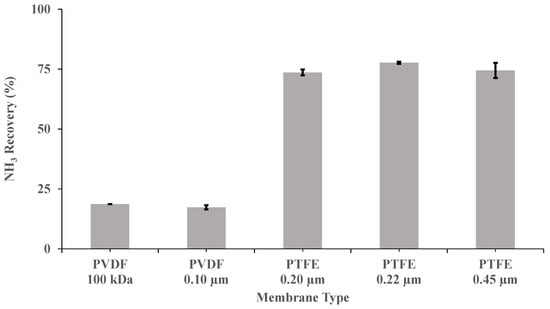 Five flat sheet membranes (Table 1) were investigated at a recirculation flow rate of 0.030 m3 h−1, a pH of 10 and a concentration of H2SO4 of 1 M, to elucidate the optimum material, pore size and wettability for NH3 recovery from a synthetic digestate. PTFE membranes exhibited a superior performance to PVDF membranes in terms of NH3 recovery at a pH of 10 (Figure 2). In this case, the highest NH3 removal recovery after 3.5 h (77.7% ± 0.4%) was provided by PTFE-0.22. This removal efficiency was 3.6-fold higher than those obtained for the two PVDF membranes tested. As shown in Table 1, PTFE-0.22 has a contact angle (θ) of 150 degrees [42], which corresponds to a rather hydrophobic surface [43]. In fact, a membrane with θ > 140° could be considered super-hydrophobic according to Tylkowski et al. [43]. The superior performance of the PTFE-0.22 membrane could be also explained by its asymmetric structure, as membranes with symmetric structures, with similar thickness, have been consistently shown to be less permeable [20]. Therefore, the following experiments were also conducted using PTFE-0.22 membranes.