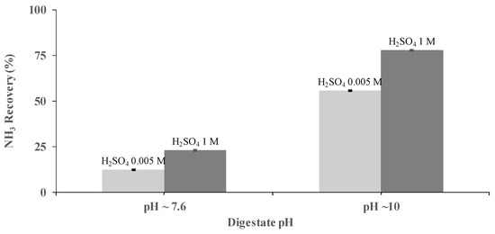 H2SO4 concentration was identified, also, as a key operational parameter for NH3 recovery. The performance of a PTFE-0.22 membrane at two concentrations of H2SO4 (0.005 and 1 M) was studied at pHs of 7.6 and 10, under a flow rate of 0.030 m3 h−1 using synthetic digestate. Acid concentrations of 0.005 M resulted in NH3 recoveries of 12.2% ± 0.2% and 55.5% ± 0.1% at a pH of 7.6 and 10, respectively, after 3.5 h of operation at the same flow rate. Similarly, under the same conditions, NH3 recoveries of 22.9% ± 0.4% and 77.7% ± 0.4% were achieved using H2SO4 concentrations of 1 M (Figure 3). Therefore, it was concluded that the best operating conditions correspond to a pH of 10 and H2SO4 concentrations of 1 M.