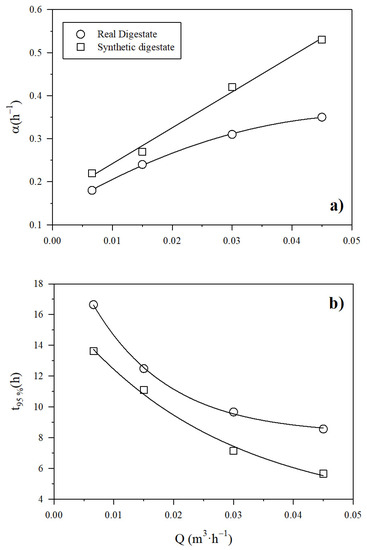 The increase in the digestate recirculation flow rate brought about a rise in the pace of the NH3 recovery across the PTFE-0.22 membrane regardless of the type of digestate (real or synthetic). Figure S2a,b (in Supplementary Material) show the exponential decrease of the ammonia concentration, which resulted in a rapid increase of NH3 recovery (Equation (7)). In Figure 4a, the corresponding rate of concentration decrease and recovery increase α, is shown as a function of the recirculation flow rate of SD and RD (Equation (8)). The value of α was higher for the synthetic digestate, while the increase in digestate recirculation flow rate was positively correlated with NH3 recovery rate regardless of the type of digestate. Figure 4b shows the evolution of the time needed to reach 95% recovery (Equation (9)). This time is higher for the real digestate than for the synthetic one. It is worth noting that an increase of the recirculation flow of the digestate from 0.007 to 0.045 m3 h−1 brought about a substantial decrease of the time needed to reach 95% recovery of NH3. In all cases, a pH of 10 was maintained. The duration of the experiment conducted at a liquid recirculation rate of 0.03 m3 h−1 was extended to 6 h, in order to check how a longer time improved recovery. This experiment resulted in a final NH3 recovery of 94.3% ± 0.3% in synthetic digestate in accordance with Figure 4b. Therefore, we concluded that over long time intervals, the evolution of recovery follows the pace assumed here.