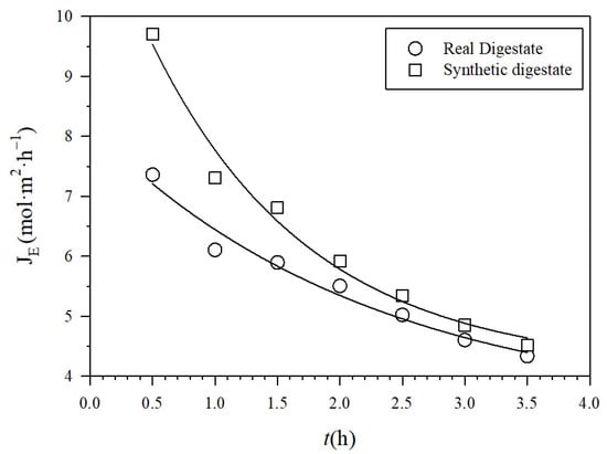 Ammonia removal efficiencies of 84.6% ± 1.0% were achieved using the PTFE-0.22 membrane after 3.5 h of experiment in synthetic digestate, which were higher than the removal efficiencies in real digestate (71.6% ± 0.3%), at 0.045 m3 h−1 and a pH of 10. The lower NH3 recoveries in real digestate were likely due to membrane fouling. This fouling affected the NH3 permeate flux mainly due to adsorption of colloids, or solutes including ammonia, within the membrane pores, with a subsequent reduction in mean pore sizes. According to Meng et al. [44], membrane fouling typically causes cake layer formation, deposition of sludge flocs and their deposition on the membrane. The influence of the velocity of the acid solution was not herein assessed as previous literature has consistently shown that the velocity of the acid solutions does not impact significantly on NH3 mass transfer [20,31].