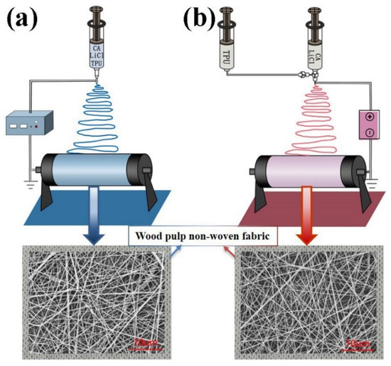 For single spinning, an CA/TPU-xLiCl spinning solution was put into a 5 mL syringe. The advancing speed of the syringe of was set to 1 mL/h, the distance between the needle and the receiving drum was 18 cm, and the spinning voltage was 20 kV. The electrospun membrane was collected on the grounded roller at a rotating speed of 200 r/min with melt blown cloth (Figure 1a). The spinning was performed under a temperature of 27 ± 2 °C and a humidity of 40%–45%. The fabricated membranes were placed in an oven at 60 °C for 24 h to remove the residual solvent. The obtained CA/TPU-LiCl membrane fabricated with different concentrations of LiCl was denoted as CA/TPU-xLiCl.