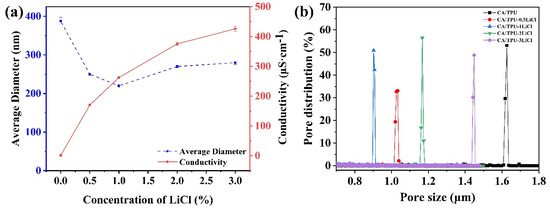 (a) Average diameter of the CA/TPU-xLiCl fibers and conductivity of the spinning solutions with different LiCl concentrations; (b) Pore size distribution of the CA/TPU-xLiCl membranes.