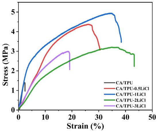 Stress-strain curves of each CA/TPU-xLiCl fiber membrane.