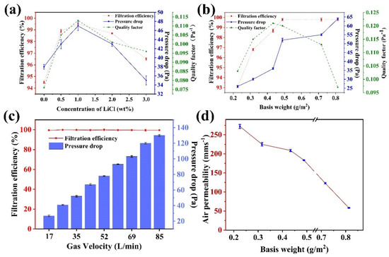(a) Filtration performance of CA/TPU-xLiCl membrane under 35 L/min gas velocity; (b) Filtration performance of CA/TPU-1LiCl membrane with various basis weight under 35 L/min gas velocity; (c) Filtration performance of CA/TPU-1LiCl membrane under different gas velocity; (d) Air permeability of CA/TPU-1LiCl membranes with different gram weight.