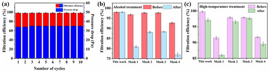 The fiber membrane and commercial mask were placed in a water bath and treated at 100 °C for 4 h. The fiber membrane and commercial mask were immersed in anhydrous ethanol for 4 h. The effects of high temperature and alcohol disinfection on the filtration performance of filter membrane and commercial mask were compared.