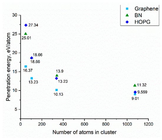 Upon irradiation, one can observe defect formation on the graphene sheet, when the incident energy was higher than the threshold value. According to our calculations, the threshold energy of an accelerated argon cluster capable of penetrating and creating a nanopore in graphene was 9.01 eV/atom. Similar calculations for HOPG and boron nitride were 9.559 eV/atom, and 11.32 eV/atom, respectively. The calculation results are shown in Figure 2.