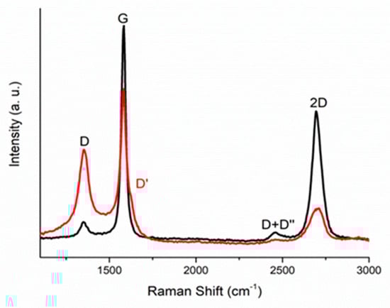 Raman spectra of the initial (unirradiated) and resulting (irradiated) MLG samples are shown in Figure 3 with black and red lines, respectively. Four peaks, typical of MLG, can be seen in the depicted spectra. For the initial sample, the D band at about 1350 cm−1 appears due to transverse optical phonons at the edges in the Brillouin zone K. This is associated with vibrations of six atomic graphene rings, and requires a defect for its activation. For unirradiated graphene, the D peak was small, which indicated its low defectiveness. The faint band at about 2450 cm−1 was attributed to the combination of the D-phonon and the acoustic longitudinal phonon (D′′), and was thus called D + D′′. The G band at about 1590 cm−1 was due to first-order Raman scattering by doubly degenerate vibration modes in the plane (plane optical transverse and longitudinal phonons) at the center of the Brillouin zone. The band at about 2680 cm−1 appeared due to second-order Raman scattering on plane transverse optical phonons, near the Brillouin zone boundary, and was closely related to the electronic structure of the band.