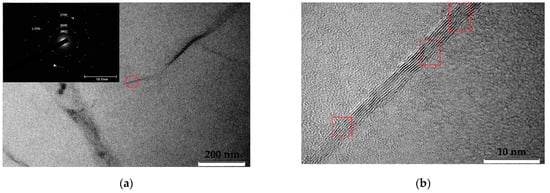 Both initial and irradiated MLG were deposited on ultrafine copper grids and were identified in a TEM (JEOL JEM 2100 operating at 200 kV). TEM results are seen in Figure 4 and Figure 5, respectively. Graphene layers have a wrinkled paper-like multilayer structure. TEM images revealed high-contrast areas indicating different graphene orientations; see Figure 4a and Figure 5a. The number of graphene layers in sheets was determined by inspecting the edges of a folded region; see Figure 4b and Figure 5b. The electron diffraction corresponding to these regions confirmed that it was polycrystalline graphene film; see Figure 4a and Figure 5a. Bright spots on the diffraction rings indicated large graphene crystallites. In the unirradiated sample Figure 4b, graphene layers had no disturbances or broken spots, and the distance between layers was rather uniform.