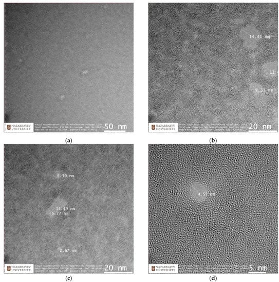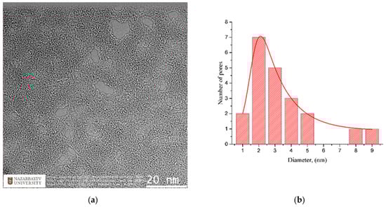 The pore size calculation was carried out using the ImageJ (https://imagej.nih.gov/ij/index.html, accessed on 21 December 2021) software package, which allows direct measurement of pores on TEM-images using a special ruler, and subsequently stores relevant data in a text file. Moreover, the pore-size distribution was captured using a standard graphical editor; see Figure 7. The predominant pore size in our sample was 2 nm, with an average diameter around 3 nm, as can be seen in the included histogram. Literature data on the sizes of nanopores in graphene structures vary greatly depending on their manufacturing method. For comparison, we cite several radiation methods, including gamma rays, focused beam and ultraviolet. In particular, nanoscale pores with average size of ∼3 nm were generated across 10 μm thick graphene oxide bucky-papers, by gamma ray irradiation in hydrogen []. Nanopores with a diameter of <10 nm were fabricated in graphene layers by Fox at al. [], using a low-energy electron beam. Celebi et al. [] used a focused ion beam to produce pores with diameters between less than 10 nm and 1 μm, in double-layer graphene. In Ref. [], pores with a diameter of 0.40 ± 0.24 nm in graphene were fabricated by ion bombardment and oxidative etching. In Ref. [] graphene nano-meshes with a pore size of ∼200 nm were obtained using UV-assisted photodegradation of the graphene oxide sheets.