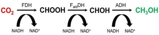 The photocatalytic approach was introduced as an alternative method for catalyzing the reduction of CO2 to CH3OH, as it could provide a lower energy route by utilizing solar energy. Although the photocatalysts involved are abundant and easy to obtain [], photocatalytic activity is still low for reducing CO2 [,]. Other than that, there is another attractive route that could be applied, namely, the biocatalytic pathway, which Obert and Dave [] reported. This could replace the chemical catalytic route for converting CO2 into CH3OH—a process using three dehydrogenase enzymes: formate dehydrogenase (FDH), formaldehyde dehydrogenase (FaldDH), and alcohol dehydrogenase (ADH). The multi-enzymatic CO2 reduction also requires an equimolar electron donor, namely, nicotinamide adenine dinucleotide (NADH), to initiate the reaction. Three moles of NADH are needed to produce one mole of CH3OH in this multi-enzymatic cascade catalysis. The usage of enzymes is very appealing, as it offers a low temperature, low pressure route. Furthermore, due to the high selectivity of the dehydrogenases, the multi-enzymatic cascade catalysis could successfully be carried out in just one pot. It was noted that the FDH would first catalyze the transformation of CO2 to formic acid (CHOOH), then at the second stage the FaldDH enzyme would take part in the reduction of CHOOH to formaldehyde (CHOH), and finally the production of CH3OH would be catalyzed by ADH [,]. The detailed mechanism of cofactor (NADH)-aided CO2 reduction catalyzed by the dehydrogenase enzymes is still debated, but the number of studies focusing on the procedure for the first catalytic reaction step (CO2 + H+ + 2e− ⇆ CHOOH) have grown in the past years. The redox potential (E°′) reported for the enzymatic transformation of CO2 to formate (HCOO−) and the oxidation of NADH to NAD+ are about −420 and −320 mV, respectively []. For the NADH-dependent FDH to start catalyzing a thermodynamically stable molecule of CO2, it needs to be first solubilized in water. Following Lewis acid-base theory, CO2 dissolves in water to form carbonic acid (H2CO3), reversibly. H2CO3 will be further dissociated into bicarbonate (HCO3−) and carbonate (CO32−) ions []. It is suggested that FDH has a higher affinity towards hydrated derivatives of CO2 than gaseous forms. Commonly, the solubilization of CO2 in the reaction medium (buffer) is facilitated by carbonic anhydrase (CA). Then, the reduction of HCO3− to CHOOH via FDH would be assisted by NADH oxidation. Finally, the FaldDH and ADH enzymes would consume the substrates produced (CHOOH and CHOH) and generate CH3OH at the end of the reaction. However, there are several challenges that would need to be overcome in order to help the system achieve high efficiency: the stability of the enzyme would need to be improved, enzyme and cofactor reusability would need to be enhanced, and a feasible, simple and efficient reactor setup that is suitable to operate the multi-enzymatic cascade system would have to be designed []. Figure 1 shows the biocatalytic pathway of the enzymatic conversion of CO2 to CH3OH reported by Obert and Dave [].