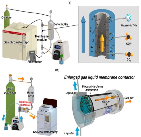 Schematic diagram of (a) the hollow fiber [] and (b) flat-sheet Janus gas–liquid membranes contactors (GLMCs) [] incorporated with encapsulated CA in TiO2 nanoparticles applied to catalyze CO2 hydration.