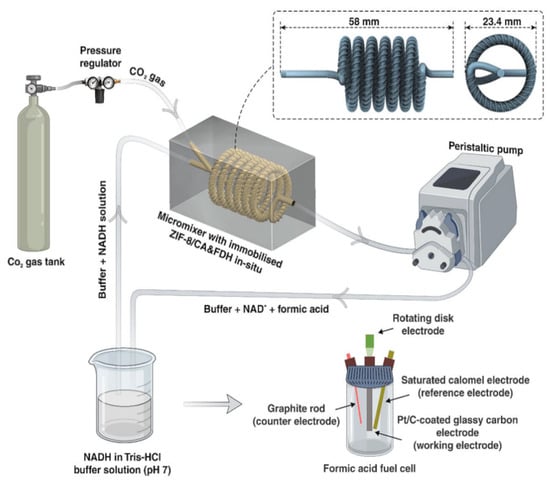 Moreover, recently, Chai et al. [] introduced the idea of applying a micromixer with a threaded channel for CO2 conversion to HCOOH. The EMR setup utilized is as shown in Figure 3. It was reported that the utilization of the micromixer could enhance the mass transfer performance for the enzymatic cascade conversion of CO2 and allow better mixing of the dissolved gas in the liquid. The CA and FDH enzymes were biomineralized in ZIF-8 thin film, which was located on the surface of the PDA/PEI functionalized micromixer channel. Besides the unique properties of ZIF-8, such as a high specific area and high thermal and chemical stability, which makes it a good immobilization support for the enzymes, the imidazole group in ZIF-8 could also take part in the CO2 hydration process and yield bicarbonate. The CO2 gas and the cofactor enzyme (NADH) solution were fed into the micromixer through two separate channels. The hydration step of CO2 would take place first, where the active site of CA, which is the zinc-bound hydroxide, would attack the carbonyl bond of CO2 and form a metal-bound bicarbonate, which would then be displaced by a H2O molecule. The bicarbonate and NADH would bind at the FDH active site, which consists of the amino acid residues. With the bicarbonate as the substrate and NADH as the terminal electron donor, HCOOH would be produced from the cascade reaction. Besides ZIF-8, UiO-66 MOFs have also been tested for CO2 reduction in GLMC. The UiO-66-NH2 thin film was reported to be a robust immobilization support for CA and FDH enzymes, however, the HCOOH yield was found to be slightly higher by utilizing the ZIF-8 thin film, these being 3.7 μmol and 5.6 μmol, respectively []. Nevertheless, both UiO-66-NH2 and ZIF-8 biocatalytic membranes showed great potential for enzymatic applications involving high operating temperatures.