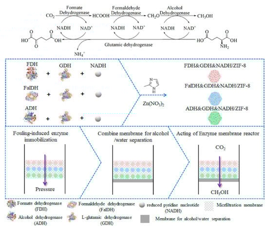 Zhu et al. entrapped each of the three dehydrogenase enzymes with the cofactors and the cofactor-regenerating enzymes (glutamate dehydrogenase), together with ZIF-8, forming nanocomposites (Figure 4) []. These nanocomposites were then filtrated in a microporous PVDF membrane via a fouling-induced enzyme immobilization technique adopted from Luo and co-workers []. The setup enhanced the transformation of CO2 to methanol, and 50% of their original productivity was retained after 12 h in reaction.