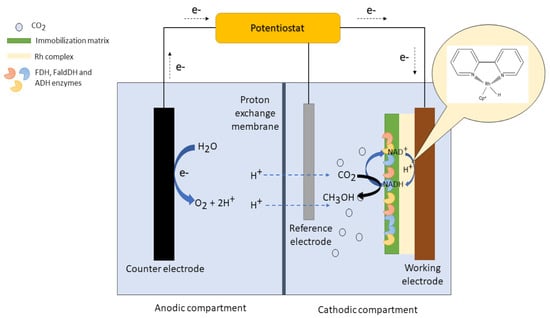 Schematic illustration of the general electrochemical cell design developed by researchers for catalyzing the enzymatic reduction of CO2, which consists of two types of compartments, namely, anodic and cathodic compartments. A Rh complex-modified working electrode was applied to prevent the production of undesired NAD2 dimers during the electrochemical regeneration of NADH and the dehydrogenase enzymes (FDH, FaldDH, and ADH) were immobilized on an immobilization matrix electrodeposited on the working electrode.