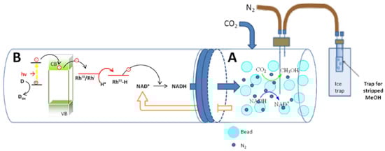 The photocatalytic approach is one of the methods that could transform CO2 into value-added chemicals and fuels without requiring high inputs of energy and high operational costs. It is inspired by natural photosynthesis in plants, in which light energy is utilized to convert CO2 into carbohydrates and O2. Along with the electrochemical regeneration of NADH, the photochemical regeneration of NADH has been widely studied by researchers, as it could enable the development of a greener and more sustainable route than the electrochemical approach. To initiate the photochemical regeneration of NADH, similar to the electrochemical method, the process also requires a metal catalyst (semiconductor), an electron donor, and an electron mediator. There are various types of semiconductor materials that could be applied for NADH regeneration, such as titanium oxide (TiO2), cadmium sulfide (CdS), iron(III) oxide (Fe2O3), copper(I) oxide (Cu2O), indium vanadate (InVO4), etc. []. However, TiO2 is the most widely applied photocatalyst for catalyzing the regeneration of NADH due to its excellent catalytic properties, high stability, abundance, and low cost []. There are also several types of electron donors that can be utilized for the reaction, including EDTA, TEOA, and H2O. It has been reported that EDTA has the best interaction with TiO2 and better properties compared to TEOA and H2O []. Figure 7 shows the overall setup of the photocatalytic reactor system. To convert CO2 biocatalytically in a photocatalytic reactor system, first, the light harvesting step would take place, in which light would be absorbed by the semiconductor. For photocatalysis to occur, the amount of solar energy absorbed by the semiconductor must be higher than or equal to the band gap energy []. After the successful light absorption step, the electrons would be generated at the valence band (VB) and excite the conduction band (CB), leading to the production of the electron–hole pair. The photoexcited electrons would then move towards the outer surface of the semiconductor and be captured by the electron mediator. Next, the reduction of the mediator is expected to take place. The reduced form of mediator having reacted with NAD+, the oxidation of the mediator would occur and initiate the reduction of NAD+ to NADH. The oxidation of the electron donor would also take place due to the presence of the photoinduced holes. Finally, the photogenerated NADH would then be used to assist the multi-enzymatic conversion of CO2 to produce CH3OH.