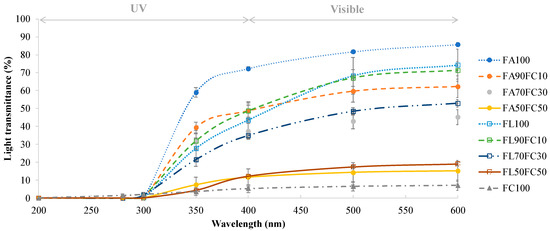 Light transmittance (%) of the films at different wavelengths (200–600 nm). FA refers to acidified plasma protein, FL to lyophilized plasma protein and FC to NFC. The number refers to the percentage of each component added to prepare the film. ANOVA and LSD were performed. Significant differences (p < 0.05) were found between four different groups (FA100, FL100-FA90FC10-FL90FL10, FA70FC30-FL70FC30, and FC100-FA50FC50-FL50FC50).