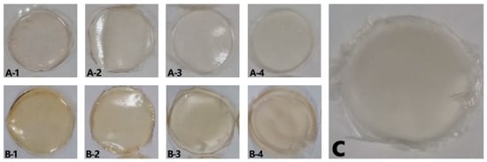 Visual appearance of the films. (A-1) FA100, (A-2) FA90FC10, (A-3) FA70FC30, (A-4) FA50FC50, (B-1) FL100, (B-2) FL90FC10, (B-3) FL70FC30, (B-4) FL50FC50, and (C) FC100. FA refers to acidified plasma protein, FL to lyophilized plasma protein, and FC to NFC. The number refers to the percentage of each component added to prepare the film.