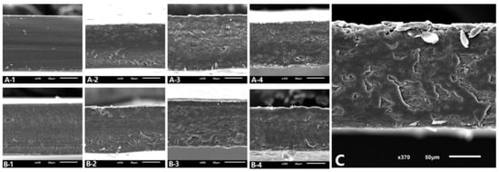 SEM images of the cross-section of the films. Scale bars correspond to 50 µm. (A-1) FA100, (A-2) FA90FC10, (A-3) FA70FC30, (A-4) FA50FC50, (B-1) FL100, (B-2) FL90FC10, (B-3) FL70FC30, (B-4) FL50FC50, and (C) FC100. FA refers to acidified plasma protein, FL to lyophilized plasma protein, and FC to NFC. The number refers to the percentage of each component added to prepare the film.