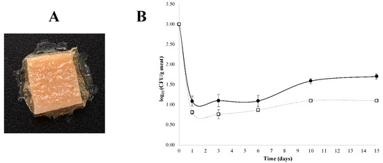 (A) Visual appearance of pieces of meat wrapped with FA90FC10 films additivated with nisin. (B) Evolution of S. aureus growth in meat for 15 days storage at 4 °C; (□) FA90FC10 films additivated with nisin and (●) FA90FC10 control films without nisin. ANOVA and LSD were performed. Significant differences between samples were found from day 6.