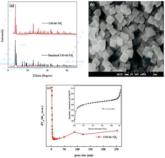 (a) XRD patterns of synthesized UiO-66-NH2, (b) SEM image of synthesized UiO-66-NH2, (c) nitrogen adsorption isotherm (77 K) and pore size distributions of UiO-66-NH2.