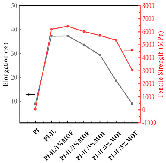 Mechanical properties of PI (PI), PI-IL (PI-IL) and PI-IL/x% (1%, 2%, 3%, 4% and 5%) MOF membranes.