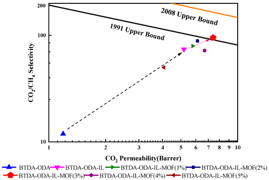 The Robeson upper bound of PI, PI-IL and PI-IL/x% MOF membranes for the gas pair of CO2/CH4 is plotted in Figure 6. The PI-IL membrane exhibits higher CO2 permeability and permselectivity compared to pure PI membrane, for which its plot moves up on Robeson’s 1991 upper bound. CO2 and CH4 permselectivities of PI-IL/x% MOF mixed matrix membrane were higher than those of the PI-IL membrane, and gas separation data approaches Robeson’s 2008 upper bound when UiO-66-NH2 filler loading content reaches 1–2%. PI-IL filled with UiO-66-NH2 at 4 and 5% exhibit lower permselectivities than the PI-IL membrane, but it is still higher than the 1991 upper bound. In summary, this increase in permselectivity confirmed that the introduction of IL and UiO-66-NH2 can enhance gas separation performance of the fabricated membranes.