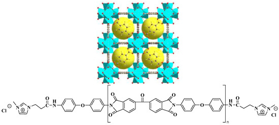 However, when the metal-organic framework is blended with the polymer matrix, their inadequate compatibility often results in inhomogeneous dispersion [27]. Ionic liquids (ILs) are characterized by high compatibility and good thermal stability [28]. As green solvents, ionic liquids have been considered as a promising substance for CO2 separation. Zhang et al. [29] described a supported ionic liquid membrane (SILM) that achieved high CO2 permeability and selectivity for CO2/N2 (2540 Barrers and 127, respectively). A new class of CA (cellulose acetate)-derived poly(ionic liquid) as a thin film composite membrane for CO2 separation was reported by Nikolaeva et al. [30]. Incorporation of ionic moiety into the polymer structure resulted in a considerable threefold increase in CO2 permeability compared to pure CA, with only a slight decrease in selectivity.