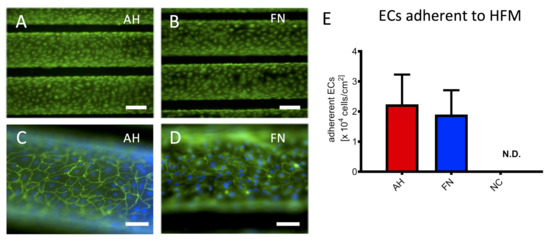 Viability, confluence and quantification of ECs adherent to HFM. Viable ECs on AH (A) and FN (B) coated HFM were visualized using calcein staining (green); Scale: 200 µm, VE-cadherin (green) and Hoechst (blue) indicated intercellular connection between ECs on AH (C) and FN (D) coated HFM; Scale: 100 µm. (E) Quantification of adherent ECs on AH and FN coated HFM, ECs on non-coated (NC) HFM were not detectable (N.D.).