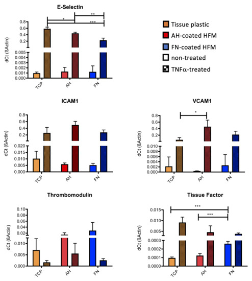 To assess, if AH, or rather FN coating had an impact on the physiologic anti-thrombogenic and non-inflammatory status of the seeded ECs, expression levels of EC-specific genes, which are associated with activation and thrombogenesis, were analyzed (Figure 3). No significant differences in the expression levels of the pro-inflammatory E-Selectin, VCAM1 and ICAM1 could be detected for unstimulated ECs cultivated on TCP compared to ECs on AH and FN coated HFM. Further, anti-thrombogenic thrombomodulin presented the highest expression levels in the non-stimulated ECs on FN coated HFM. In contrast, a significant but negligible increase in the expression level of tissue factor could also be seen for these unstimulated ECs compared to ECs on TCP and AH coated HFM. In general, endothelial activation status could be physiologically induced on all surfaces, as detected by the respective significant increases of the expression levels of E-Selectin, VCAM1, ICAM1 and tissue factor after TNFα stimulation and in comparison to the respective unstimulated ECs of each group. However, in detail the expression level of E-Selectin was significantly higher for TNFα-stimulated ECs on TCP and on AH coated HFM compared to FN coated HFM, presenting the lowest expression level.