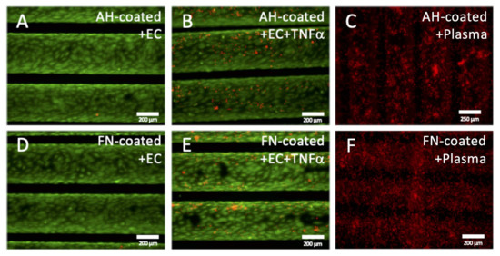 Leukocyte adhesion assay. Untreated (A,D), or rather TNFα stimulated (B,E) EC monolayers (green) on AH (A,B) and FN (D,E) coated HFM, also non-endothelialized AH (C) and FN coated HFM (F) after blood plasma immersion were incubated with HL-60 leukocytes (red); Scale: 200 µm.