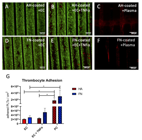 Platelet adhesion assay. For qualitative analysis, untreated (A,D), or rather TNFα stimulated (B,E) EC monolayers (green) on AH (A,B) and FN (D,E) coated HFM, also non-endothelialized AH (C) and FN coated HFM (F) after blood plasma immersion were incubated with thrombocytes (red); Scale: 250 µm. (G) Quantification of adherent thrombocytes on the respective endothelialized or non-seeded positive control (PC) HFM (*: p < 0.05).