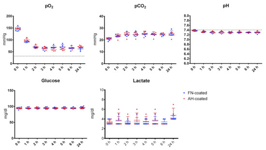 Within flow exposure experiments a stepwise increase of the flow rate in the first two hours was performed, at which the pO2 decreased steadily for both coated and endothelialized HFM without any significant difference (AH coated 146 ± 2.83 mmHg to 71.23 ± 6.62 mmHg, FN coated 147 ± 9.52 mmHg to 73.07 ± 11.69 mmHg) until reaching a stable plateau of around 68.12 mmHg until the end of the experiment. Levels of pCO2 developed opposed, from their starting values (AH coated 21.20 ± 0.87 mmHg, FN coated 20.28 ± 1.66 mmHg) up to the stable plateau around 24.7 mmHg after two h. During all experiments (n = 4), and irrespective of the coating type, pH, glucose and lactate values did not change significantly throughout the flow exposure time (Figure 6).