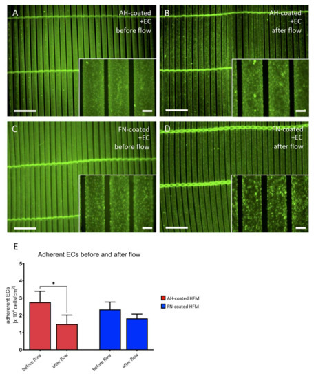 In contrast, a significant cell loss was shown for ECs on AH coated HFM (prior to flow exposure: 1.49 ± 0.52 × 104 ECs/cm2 vs. after flow exposure: 2.76 ± 0.64 × 104 ECs/cm2, p < 0.05), while no statistically significant difference with the respect to the ECs on FN coated HFM could be detected (prior flow exposure 2.34 ± 0.43 × 104 ECs/cm2 vs. after flow exposure: 1.82 ± 0.25 × 104 ECs/cm2, p > 0.05) (Figure 7E).
