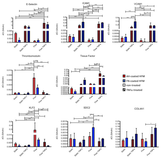 EC monolayers established on both coated HFM with and without TNFα stimulation were analyzed and compared to statically cultivated ECs (n = 4) using qRT-PCR, relative expression levels of genes, which are indicative for cell activation in response to shear stress (Figure 8). As already seen in Figure 3, TNFα stimulation resulted in increased expression levels of all activation state markers (E-Selectin, ICAM1, VCAM1), though no major changes in gene expression levels of ECs under static cultivation to flow exposure could be detected. Thrombomodulin expression was significantly upregulated in ECs on AH coated HFM after flow exposure compared to the ECs on the FN coated HFM. Upon activation with TNFα under flow conditions, the expression level dropped again to the level detected under static conditions. Although a higher mean value for the expression of thrombomodulin was detected in flow-exposed ECs on FN coated HFM compared to the expression level under static conditions, the difference was not statistically significant. With regard to tissue factor, comparable levels were obtained for deliberately activated ECs under static condition, also for ECs on both coated HFM types after flow exposure. However, a significantly higher expression for tissue factor on both coatings was detected when flow-exposed ECs were additionally activated with TNFα.