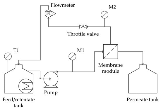 The feed solution was dosed using a pressure pump (Zuwa Combistar, 2000-A Hennlich Group, Schärding, Austria). The pressure was kept constant at the values presented in Table 2. The temperature was kept constant (20 °C) by means of an ultrathermostat MA-4 (Julabo, Uster, Switzerland). All separation processes were carried out in one hour. The scheme of installation is presented in Figure 1.
