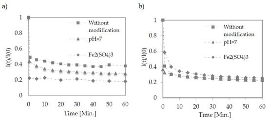 A speedy decrease in the permeate flux was observed for each tested membrane and condition (Figure 2). In Table 3, the values of permeate flux in the phase of quasi-static were obtained in each case no later than 5 min after the process.