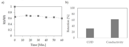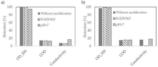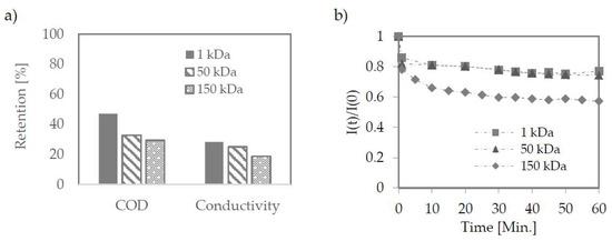 The membranes were tested at pore size 1–150 kDa. They were prepared with PES (1 kDa) as flat sheets and ceramic tubes (50 and 150 kDa). The retention coefficients for both organic and inorganic matter did not differ significantly despite large differences in the membranes used—Figure 5a.