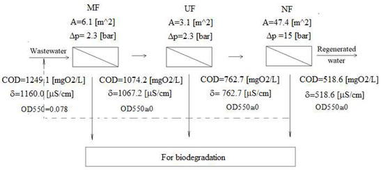 The idea of an integrated membrane separation was proposed with success for another kind of wastewater [23,24,25]. Thus, an attempt for biodiesel wastewater treatment by this method has been made. The paper proposes a three-stage cascade of membranes to purify wastewater after washing with biodiesel. The research aimed to configure the membranes for the micro, ultra, and nanofiltration process to obtain water in the permeate of technological water purity. The preliminary studies presented in this paper focused on selecting suitable membranes and their initial characterization in terms of separation capacity for chosen groups of compounds and performance in terms of permeate flux.
