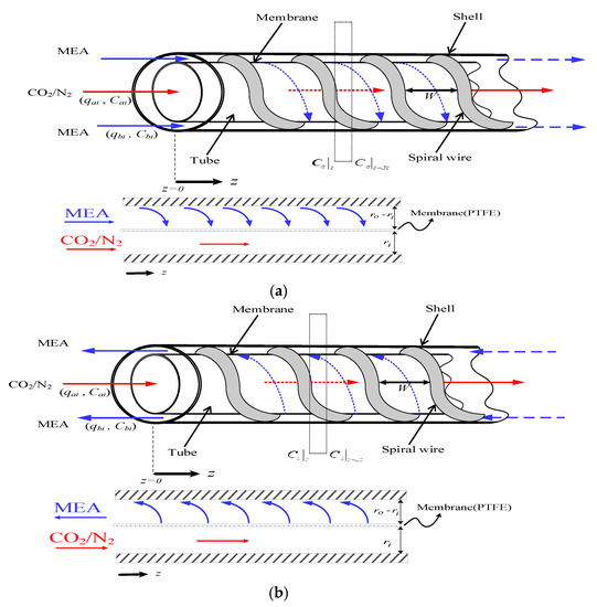 The inner tube and lumen side of the CO2/MEA membrane absorption module were flowing the CO2/N2 gas feed and MEA liquid feed, respectively, as shown in Figure 3. The modeling equations of mass balances of the gas feed and liquid feed streams were derived by making the mass flux diagram presented in a finite control element under concurrent-flow and countercurrent-flow operations in Figure 2a,b, respectively, giving: