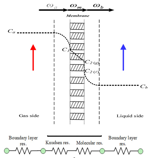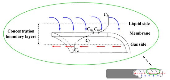 Mass-transfer resistances in series were connected and built up across the membrane adjacent to two bulk streams, including the CO2 transferring to the membrane surface, generating trans-membrane flux by Knudsen diffusion and molecular diffusion, and reaching the membrane–liquid interface to be reacted by the MEA absorbent, as with the mass-transfer resistances and CO2 concentration variations illustrated in Figure 4. The mass-transfer rate depends only on convective mass-transfer coefficients when neglecting the bottleneck of reaction rate, and the CO2 concentration on the membrane–liquid interface was determined by the dimensionless Henry’s law constant [39].