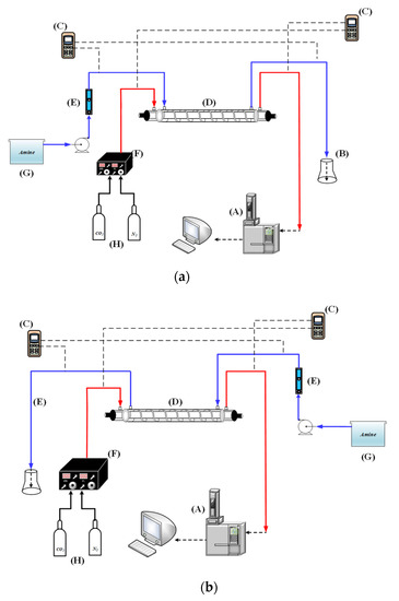 Experimental setup of spiral wired annulus channel in concentric-tube membrane module; (A) chromatograph; (B) beaker; (C) temperature indicator; (D) spiral wired concentric module; (E) flow meter; (F) mass flow controller; (G) thermostatic tank; (H) gas cylinder. (a) Concurrent-flow operations; (b) Countercurrent-flow operations.