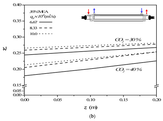 The concentration polarization coefficients were determined with various MEA feed flow rates and inlet feed CO2 concentrations as parameters once the predicted CO2 concentration distributions were obtained. The theoretical predictions of the concentration polarization coefficients show that the value of increases with increasing the MEA feed flow rates but with decreasing inlet feed CO2 concentrations. The higher the inlet CO2 feed concentration, a larger concentration gradient of CO2 on the membrane surface was produced, and hence a smaller was found in Figure 8. The higher inlet feed CO2 concentration creates a more significant concentration polarization effect on the membrane surface. The larger inlet feed CO2 concentration does not accomplish a higher value, which means the mass-transfer rate decreases when the inlet feed CO2 concentration is raised. This is because the higher inlet feed CO2 concentration does not reduce the mass-transfer resistance built up in the concentration boundary layer on the membrane surface in the MEA bulk flow. Therefore, the increased CO2 concentration caused by the higher inlet feed CO2 concentration cannot accordingly be quickly diffused to the membrane surface. Moreover, the concentration polarization coefficients increase along the MEA flowing direction in concurrent-flow operations, but decrease in the reverse z direction of countercurrent-flow operations. Similar influences of MEA feed flow rates and inlet feed CO2 concentrations on concentration polarization coefficients were confirmed in both countercurrent-flow and countercurrent-flow operations from Figure 8.