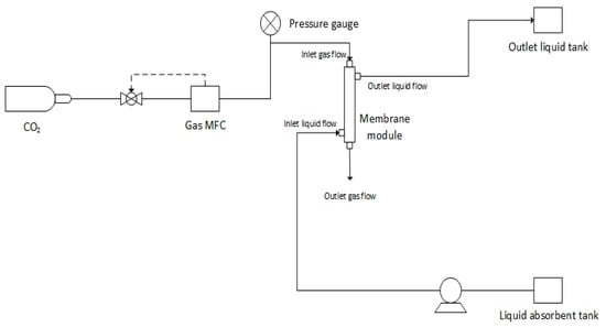 Figure 1 shows the schematic diagram of MGA for the CO2 gas absorption process. The module configuration was set up to flow in a countercurrent flow. The gas phase entered from the lumen side of the membranes, and it was released into the environment from the bottom module outlet. The liquid phase flowed countercurrent through the shell side of the membrane. The gas used in the experiment was pure CO2 gas, and the gas flow was controlled with a mass flow controller (MFC, AALBORG 0–500 mL min−1) depicted in figure below. The liquid absorbent used in this case was distilled water, and it was pumped into the shell side of the membrane using a peristaltic pump from a liquid absorbent tank. The outlet liquid absorbent was then collected in an outlet liquid tank. The feed gas flow rate and the liquid absorbent flow rate were fixed at 120 mL min−1 and 100 mL min−1, respectively. The gas side pressure was controlled to be at 1 × 105 Pa, and the liquid phase pressure was controlled to be 0.2 × 105 Pa higher than the gas phase in order to prevent any bubble formation in the liquid phase []. In every run, the system was allowed to stabilize for 30 min before taking any experimental data. The results of each run were averaged from three times of sampling; each sampling was taken every 30 min. All experiments were carried out at an atmospheric pressure (101 kPa) and at room temperature (25 °C).