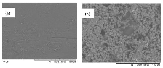 SEM surface morphology images of the pristine membrane (a) and 10 mg mL−1-polypropylene (PP)-concentration PVDF hollow fiber membrane PVDF (b) at a 1000× magnification without the non-solvent.