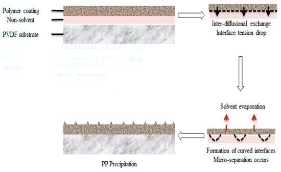 MEK in this case acted as a precipitator to induce coating layer crystallization and homogeneity []. This explained the scarcity of PP microspherulites, when the membrane was coated in the absence of MEK. When the PP solution was coated on the PVDF membrane’s surface where the non-solvent is present, a solvent–non-solvent reaction occurred. An interface between the two was formed, and inter-diffusion took place. Interface tension gradually dropped, leading to the formation of curved interfaces. In this case, it underwent phase separation, when the solvent exchanged into the non-solvent. The presence of the non-solvent produced two macroscopic phases, i.e., rich polymer phase and poor polymer phase. The concentrated polymer phase establish a continuous matrix, whereas the poor polymer phase formed pores where eventually PP precipitates, forming distribution of coarse PP coating layer []. This interaction is portrayed in Figure 3 below. In addition, high MEK volatility also played an important role in the precipitation surface structure. A high evaporation rate led to a faster solidification step, giving insufficient time of proper formation, resulting in smaller spherulite aggregates and a smoother surface []. Notably, MEK is known to give the best homogeneity as compared to other non-solvents used in previous studies, which is evenly and densely distributed microaggregates [,,].