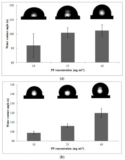Contact angles of the modified PVDF hollow fiber membrane without MEK (a) and with MEK (b). The corresponding images of water droplets are depicted for each concentration.