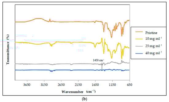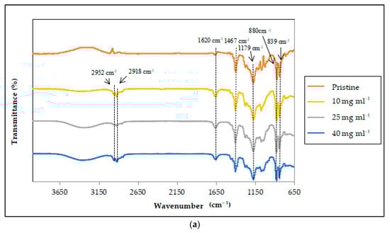 Contrary to the spectra in Figure 7a, non-identical absorption bands for the modified membranes with MEK at 25 mg mL−1 and 40 mg mL−1 PP weight concentrations were detected when compared with the pristine PVDF spectrum in Figure 7b. The peaks at 2952 cm−1 and 2833 cm−1 were also identified in this state, which further confirmed the PP coating presence. Even so, PP characteristic peaked at 1450 cm−1 with the vibration of CH3 and –CH2 around the 1470–1370 cm−1 region. The flat distorted spectra from 1370 cm−1 to 650 cm−1 conformed to the PP resemblance by previous work []. However, modified membranes PP concentration of 10 mg mL−1 with MEK still possessed the PVDF substrate characteristics with a slightly different intensity due to the formation of PP coating. Nonetheless, the resemblances of PP peaks were identical for 25 mg mL−1 and 40 mg mL−1 PP weight concentrations with MEK, and the previous peaks produced for the pristine PVDF membrane were no longer detected. Hence, this could be a clear sign of a complete covering of the PP layer on the membrane’s surface, reducing the intensity of the peak-resembling indication of PVDF. Hence, the peaks can be strengthened with proper coating consistency by enabling surface homogeneity for more accurate representation of data.